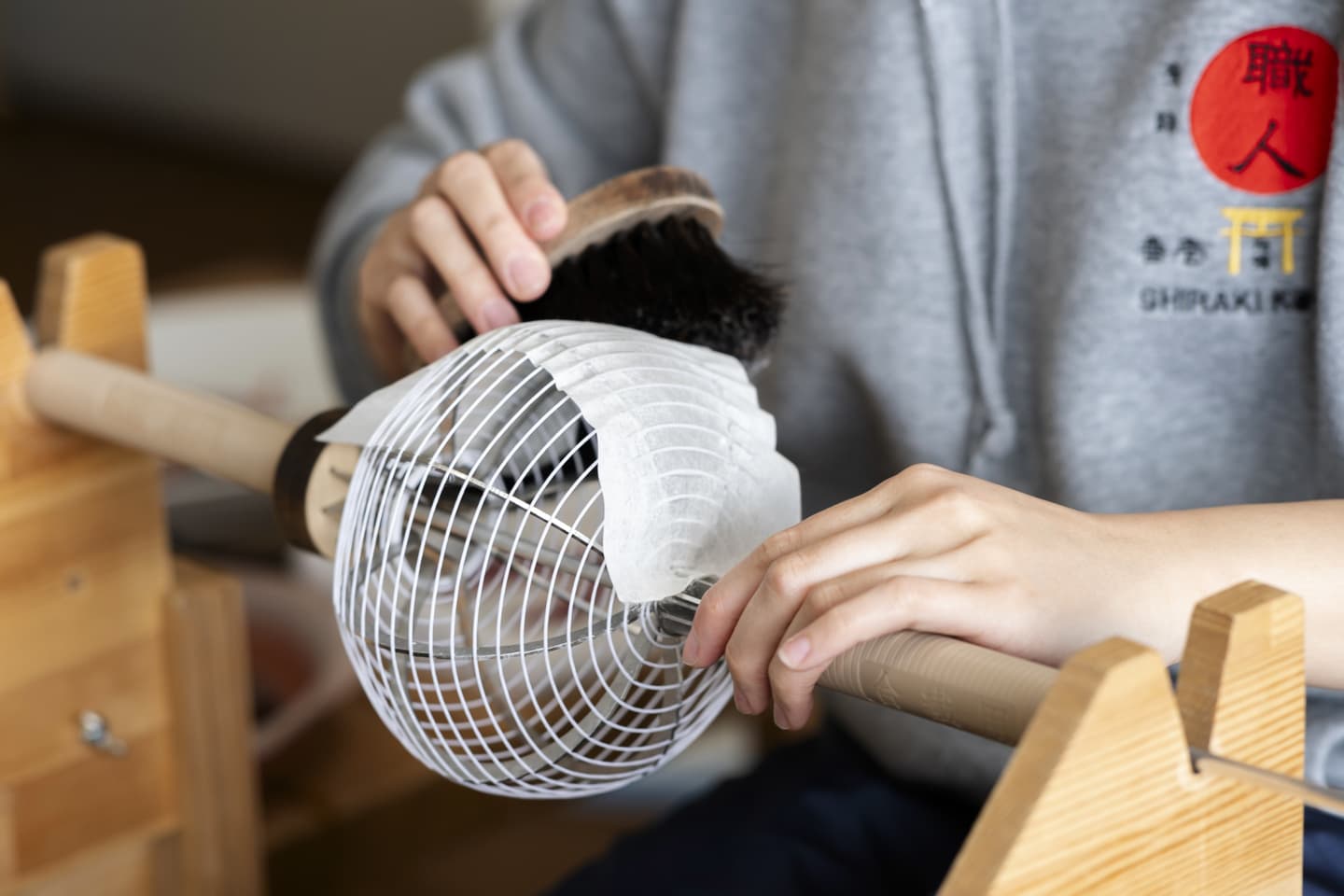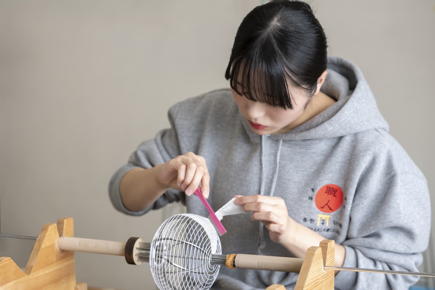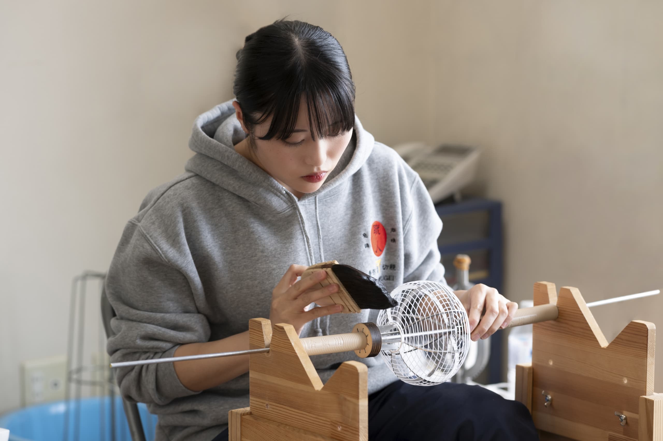 火袋作り Hibukuro 明かりが灯る部分、いわば堤灯の主役とも言うべき部分が『火袋』です。火袋に明かりが灯ると、堤灯の絵柄が半影となり、半分透けて光を通し、絵が立体的に光の中に浮かんでいるような幻想的な効果が生み出されます。火袋の基礎となる土台は、横に渡した細いヒゴと縦に渡した細い糸でできています。手の感覚を頼りに、均等に螺旋状に巻いていきます。ヒゴのお陰で、堤灯は非常に軽く、綺麗に折りたたむ事ができます。伝統的な堤灯はもちろんcocolanもこの伝統的な手法で制作されています。 手書絵付 吹絵付け ページのトップへ