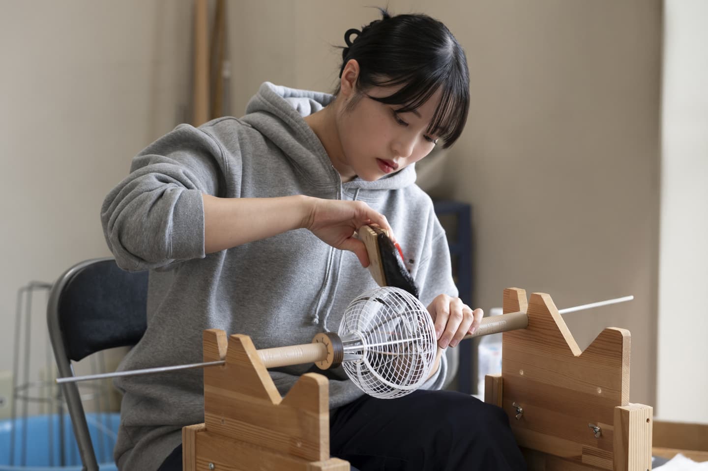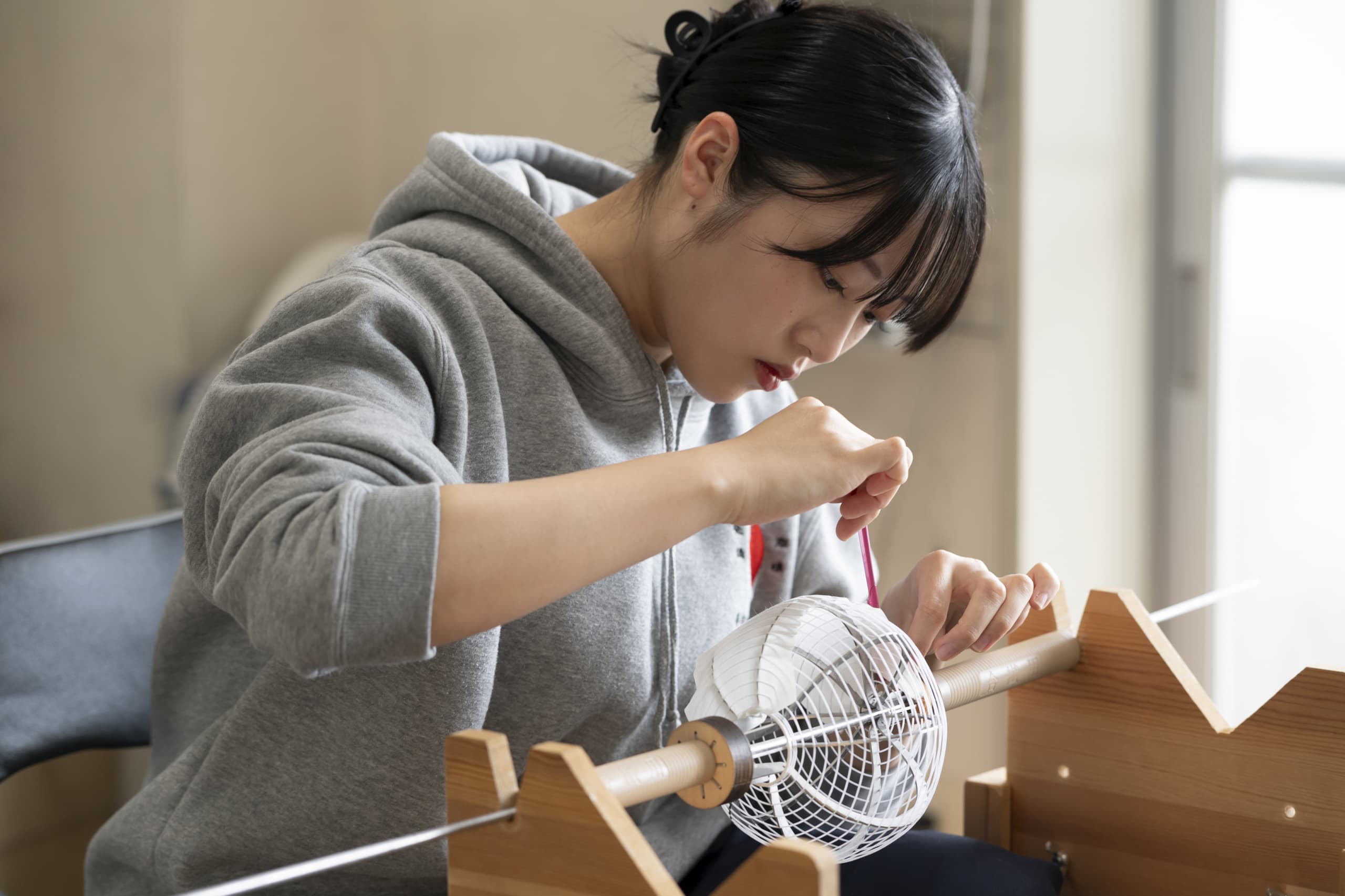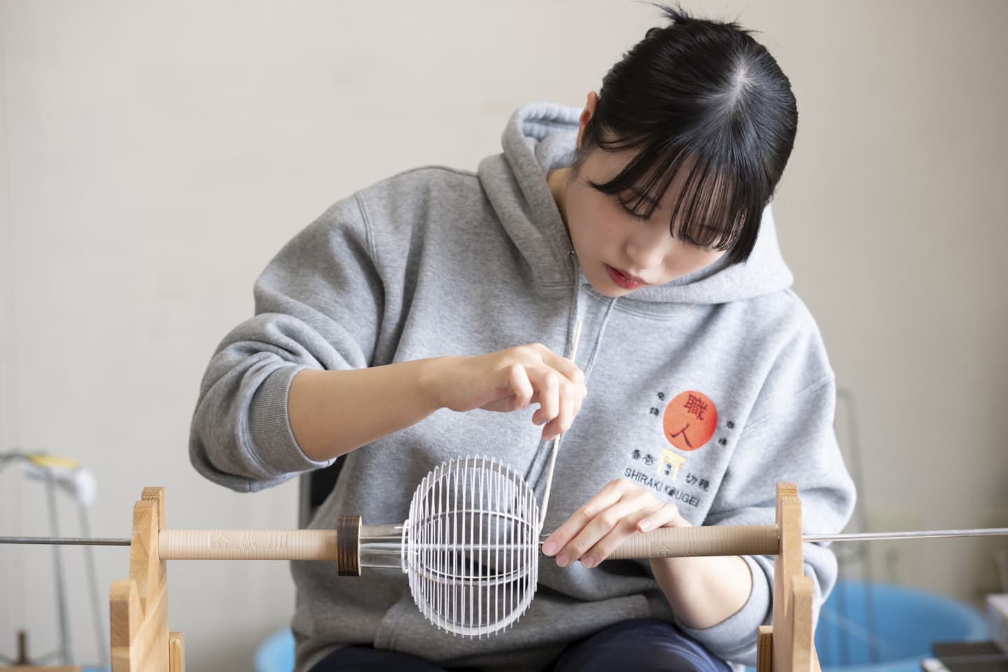 火袋作り Hibukuro 明かりが灯る部分、いわば堤灯の主役とも言うべき部分が『火袋』です。火袋に明かりが灯ると、堤灯の絵柄が半影となり、半分透けて光を通し、絵が立体的に光の中に浮かんでいるような幻想的な効果が生み出されます。火袋の基礎となる土台は、横に渡した細いヒゴと縦に渡した細い糸でできています。手の感覚を頼りに、均等に螺旋状に巻いていきます。ヒゴのお陰で、堤灯は非常に軽く、綺麗に折りたたむ事ができます。伝統的な堤灯はもちろんcocolanもこの伝統的な手法で制作されています。 手書絵付 吹絵付け ページのトップへ