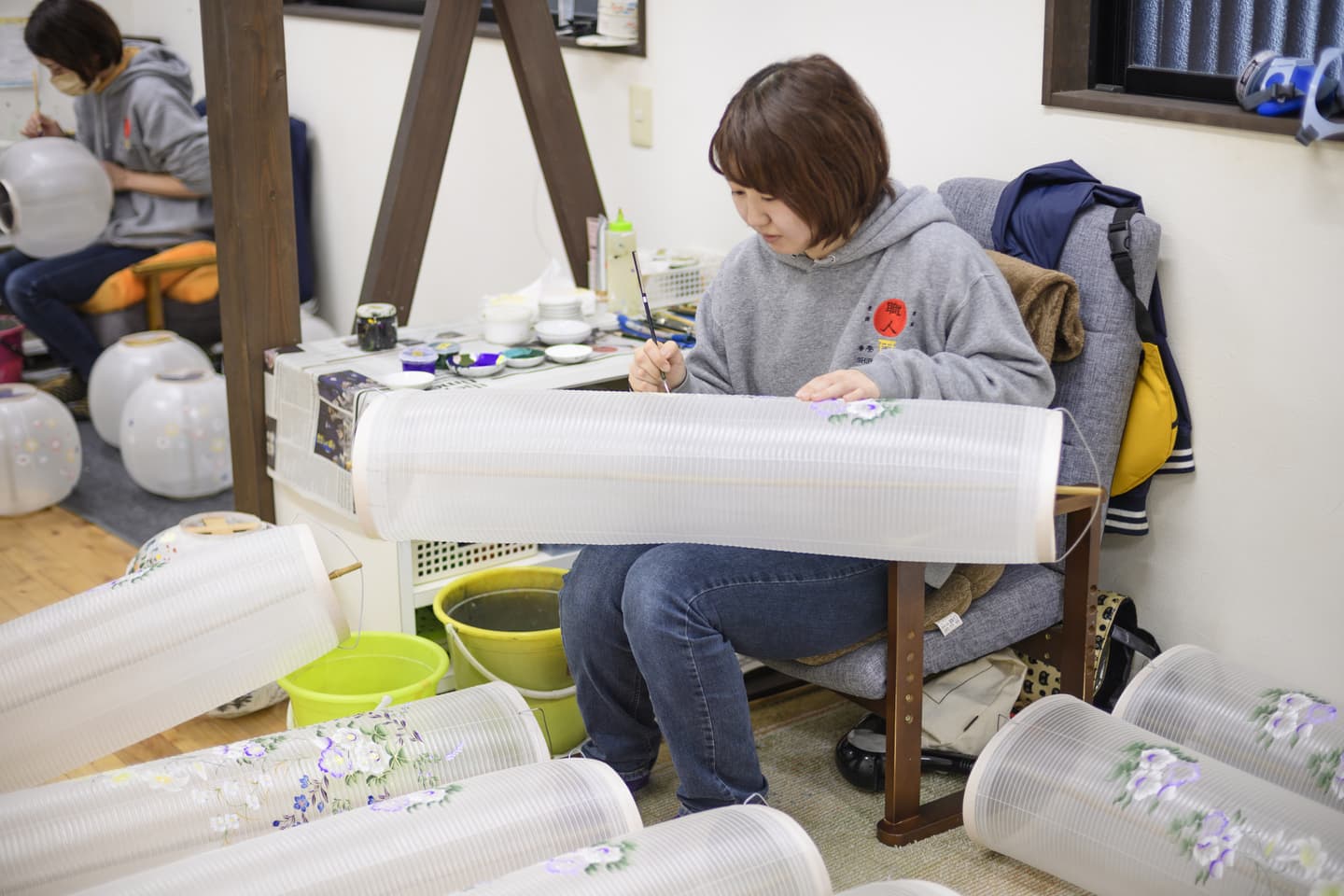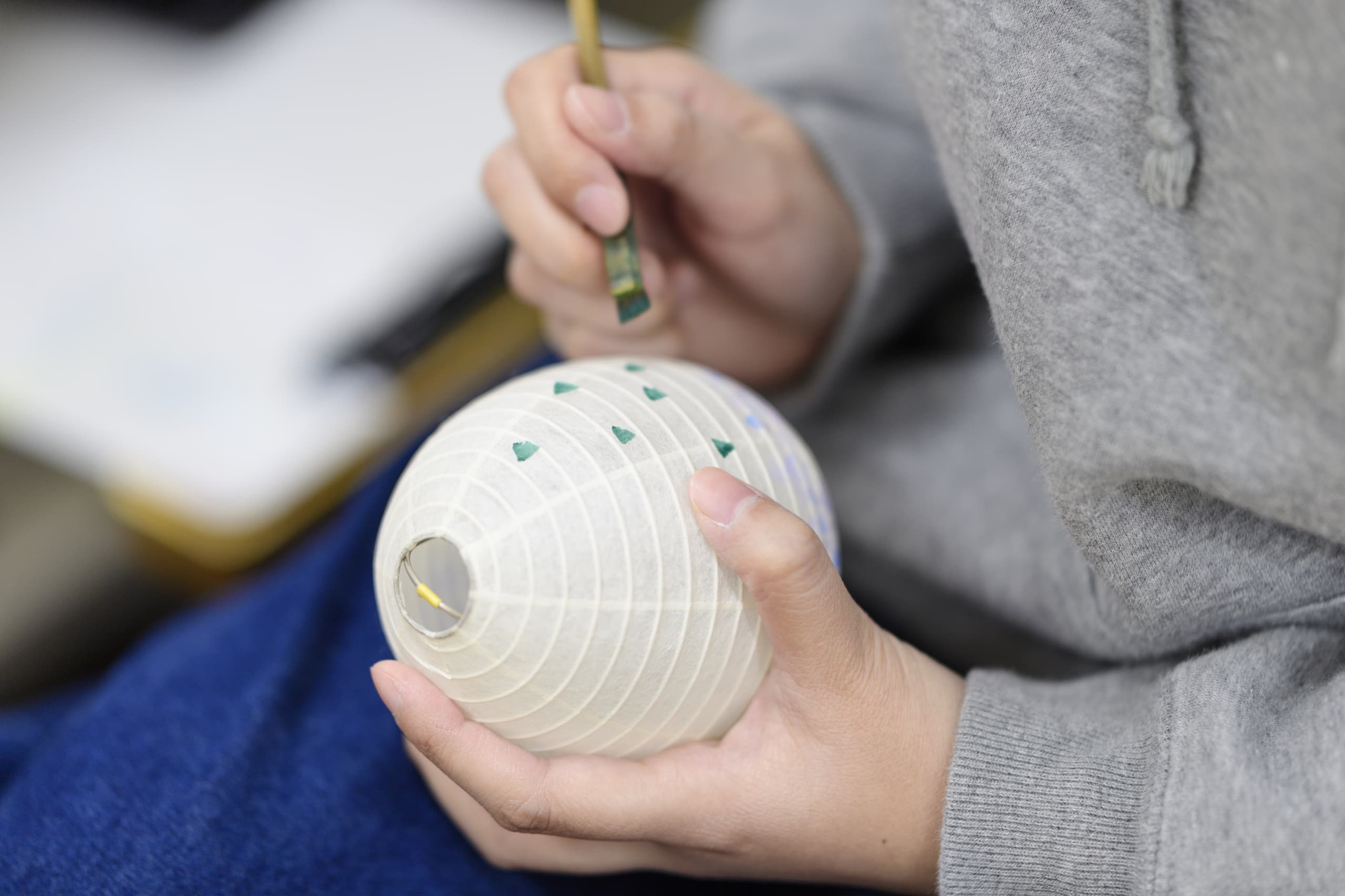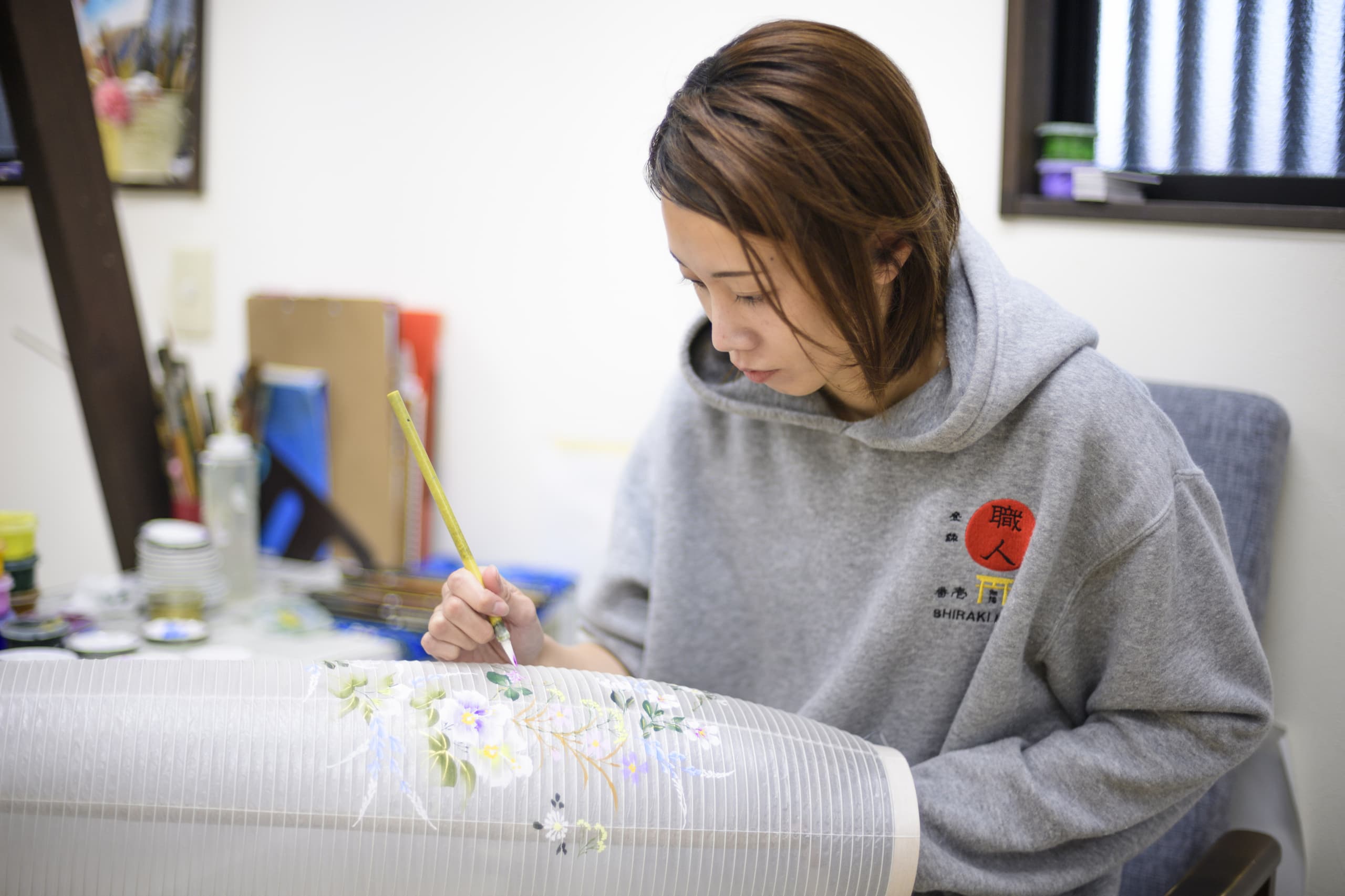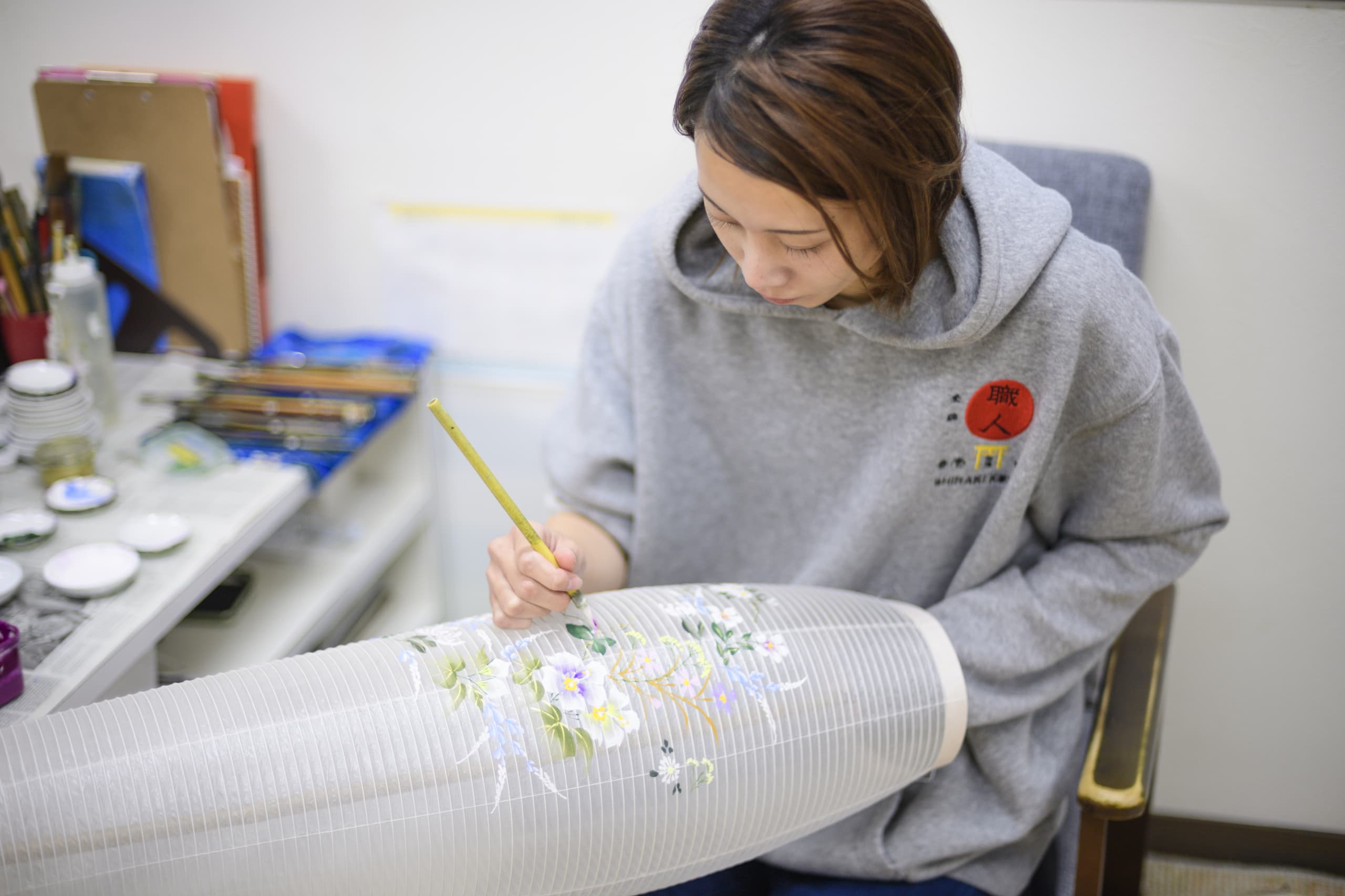 手書絵付 Tegaki etsuke 火袋の手書絵付。八女堤灯の絵柄は、グラデーション(吹き絵付)と手書絵付で表現されます。どちらもかなりの熟練した技術を要します。表現する絵柄は、蒸し暑いお盆に合わせた、草花、山水などの涼しげな柄が一般的です。グラデーションと筆づかいだけで素早くモチーフを表現する速描が、灯を灯さない時は絵として楽しめ、灯を灯すと立体的に見える奥行きのある表現を可能にいたします。 吹き絵付 火袋作り ページのトップへ