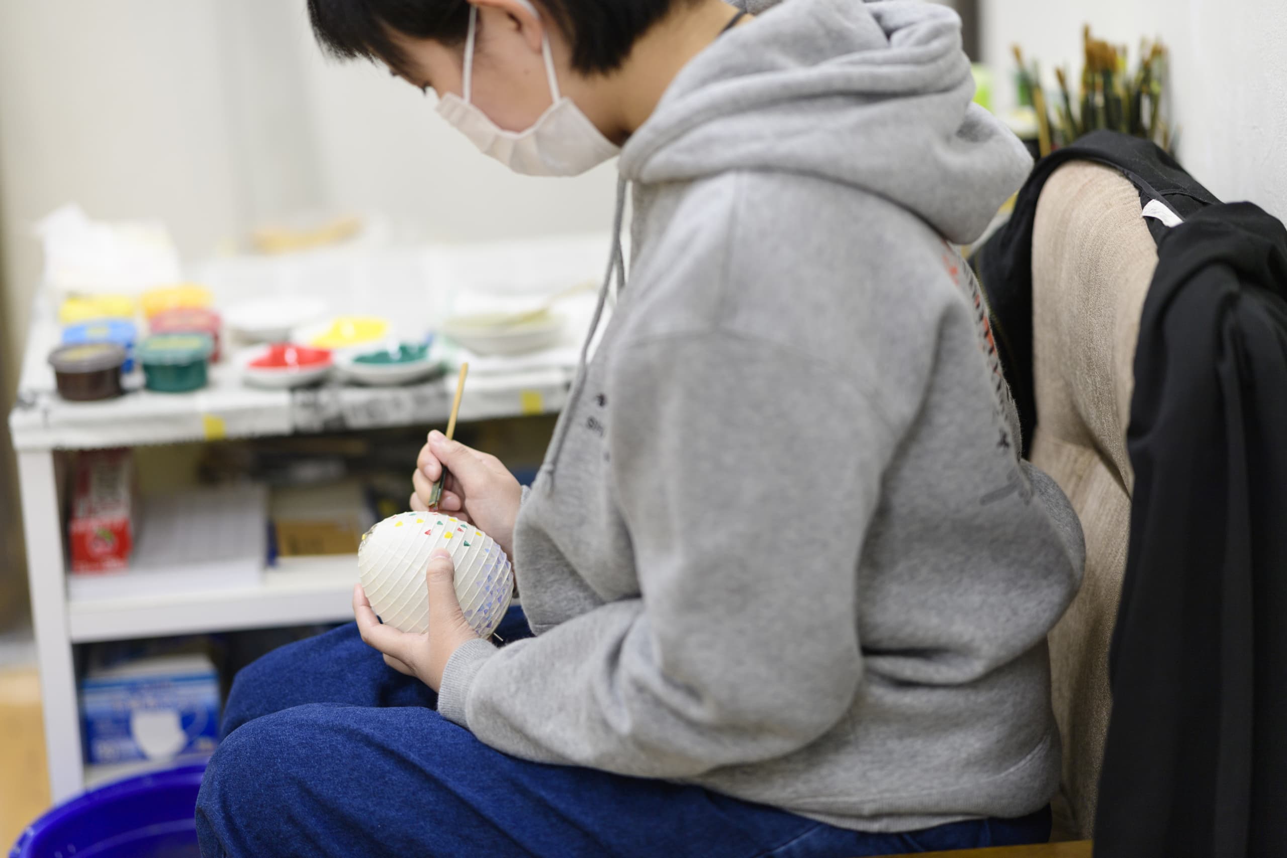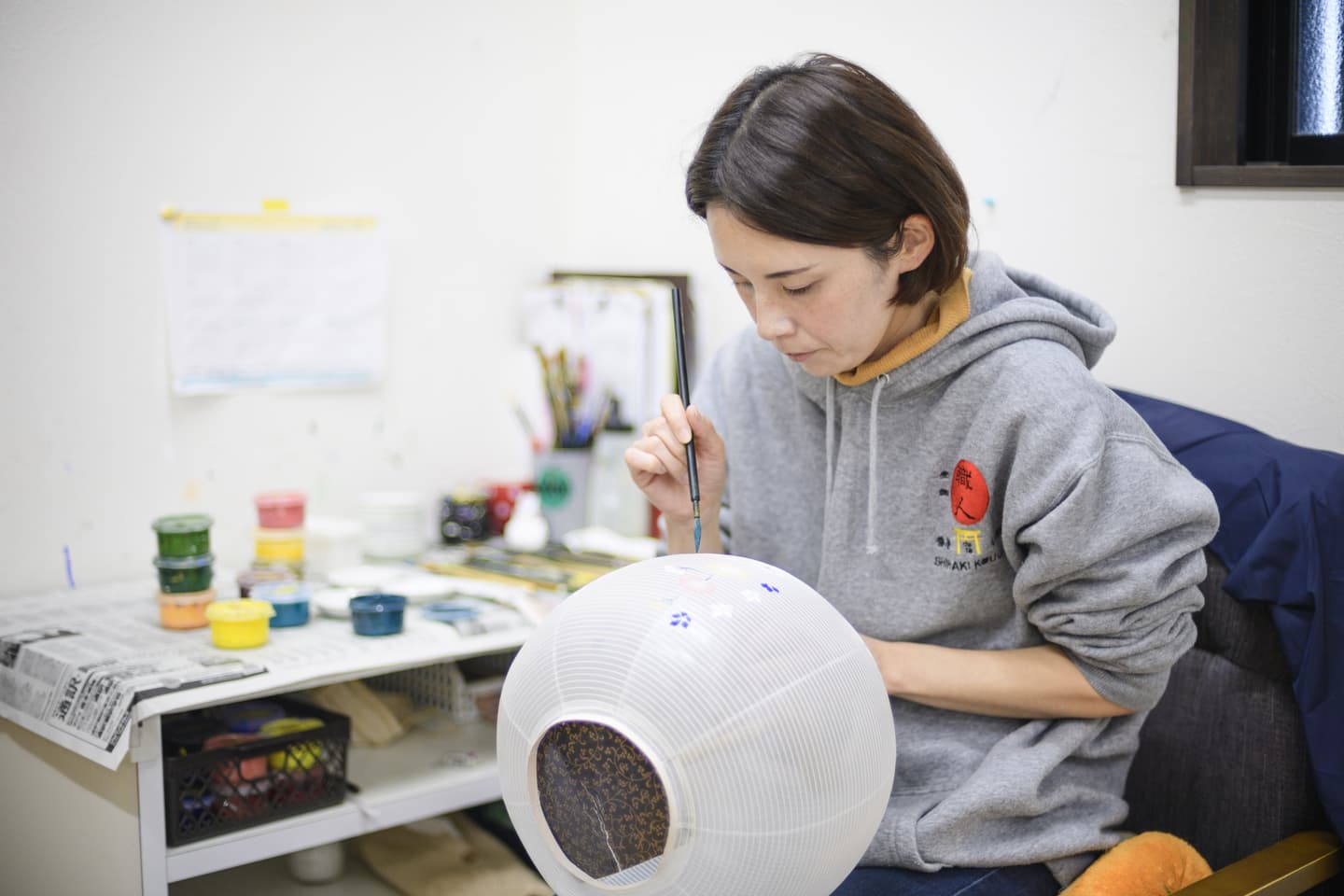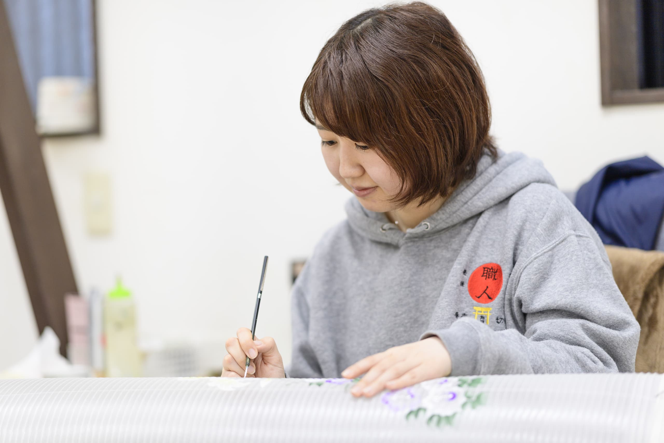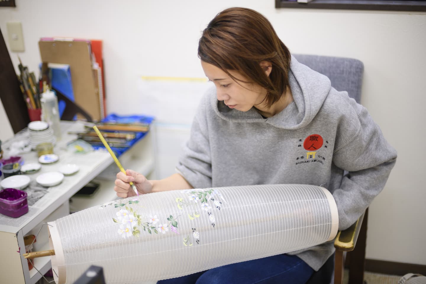 手書絵付 Tegaki etsuke 火袋の手書絵付。八女堤灯の絵柄は、グラデーション(吹き絵付)と手書絵付で表現されます。どちらもかなりの熟練した技術を要します。表現する絵柄は、蒸し暑いお盆に合わせた、草花、山水などの涼しげな柄が一般的です。グラデーションと筆づかいだけで素早くモチーフを表現する速描が、灯を灯さない時は絵として楽しめ、灯を灯すと立体的に見える奥行きのある表現を可能にいたします。 吹き絵付 火袋作り ページのトップへ